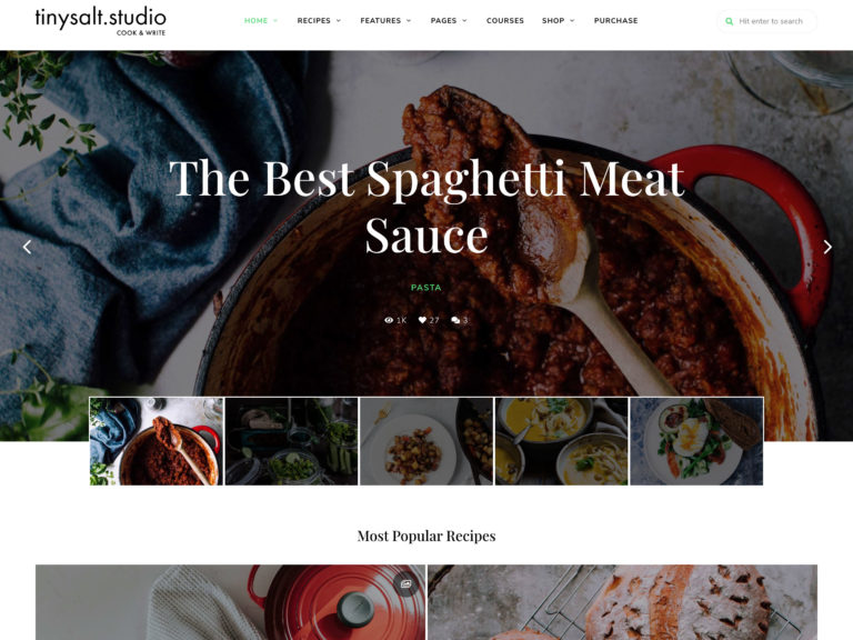 TinySalt, yemek WordPress temasına bakmak için başka bir şık ve ilginç. İçeriklerini sergilemek için kullanmak üzere klasik bir şey arayan yemek blogcuları için ideal bir seçimdir.