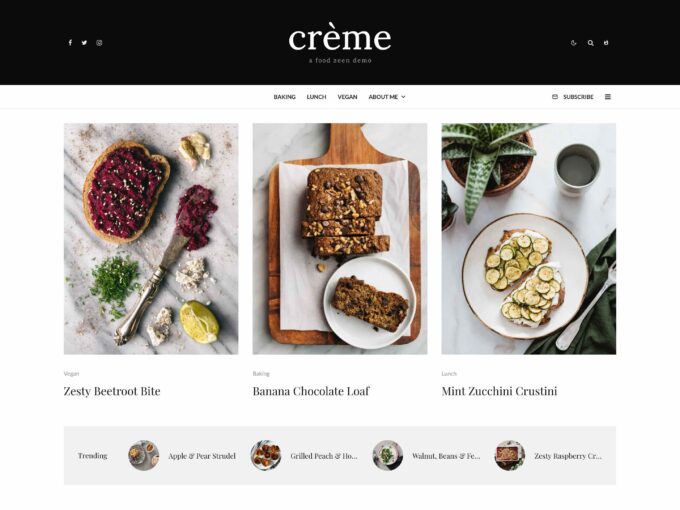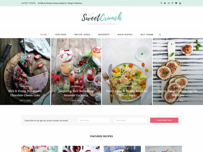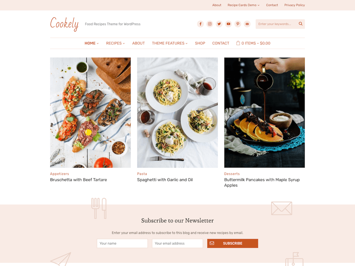 Cookely teması, tariflerinizi güzel bir şekilde düzenlemenize ve sergilemenize olanak tanıyan basit bir düzene sahiptir. Ana sayfada, en popüler tariflerinizi sergilemek için bolca alan var ve her gönderi, ziyaretçilerinizin ağzını sulandıran çarpıcı bir özellikli görsele sahip. Ayrıca, bir reklam afişi koymak için birden fazla yer bulacaksınız ve okuyucularınızı daha lezzetli tarifler için bülteninize kaydolmaya davet edeceksiniz.