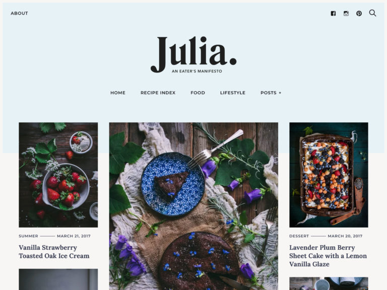Genel olarak Julia, en sofistike tarif yaratıcılarına ve yemek blogcularına uyacak şık ve klas bir temadır.
