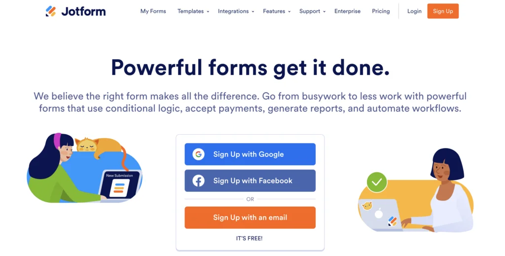 Jotform, Google Formlar'a alternatifler listemde bir sonraki sırada. Bu ücretsiz çevrimiçi form oluşturucu, ücretsiz biçiminde oldukça iyi işlevsellik ve ücretli sürümlerde çok daha fazlasını sunar.