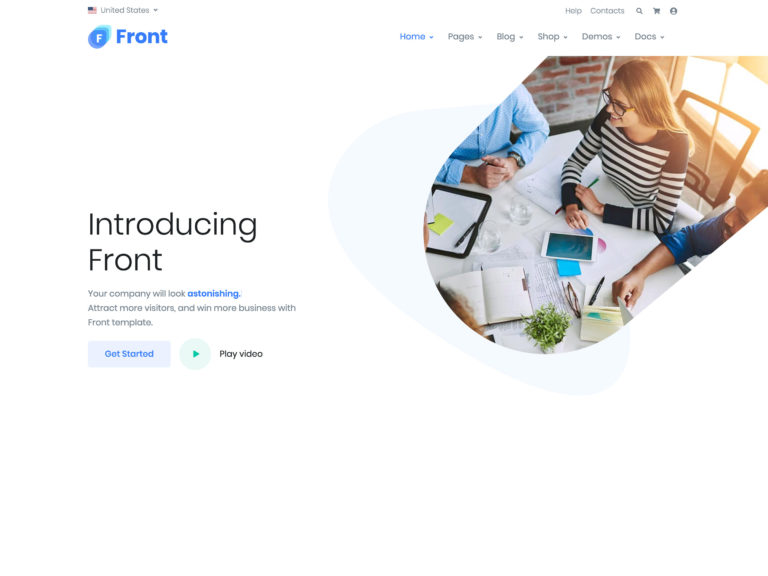 Çok amaçlı bir temadan bekleyebileceğiniz gibi, Front, çoğunlukla teknoloji girişimleri ve ajanslar için iki düzineden fazla önceden oluşturulmuş ana sayfa düzeniyle birlikte gelir. Hepsi malzeme tasarımı düşünülerek inşa edilmiştir ve tema, varsayılan bir mavi renk paletini büyük ölçüde tercih eder. Ayrıca, tüm demo düzenleri, yarışmada sunulanlardan çok daha duyarlı.