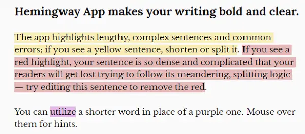 Hemingway App, gramer hatalarını kontrol etmek ve içerik kalitenizi iyileştirmek için popüler bir Grammarly alternatifidir. Web sitesini ziyaret edin ve metninizi düzenleyiciye girin. Hatalarınızı farklı renklerde vurgulayacaktır. Kırmızı vurgu, cümlenizin çok karmaşık olduğunu, sarı işaret ise uzun olduğunu gösterir.