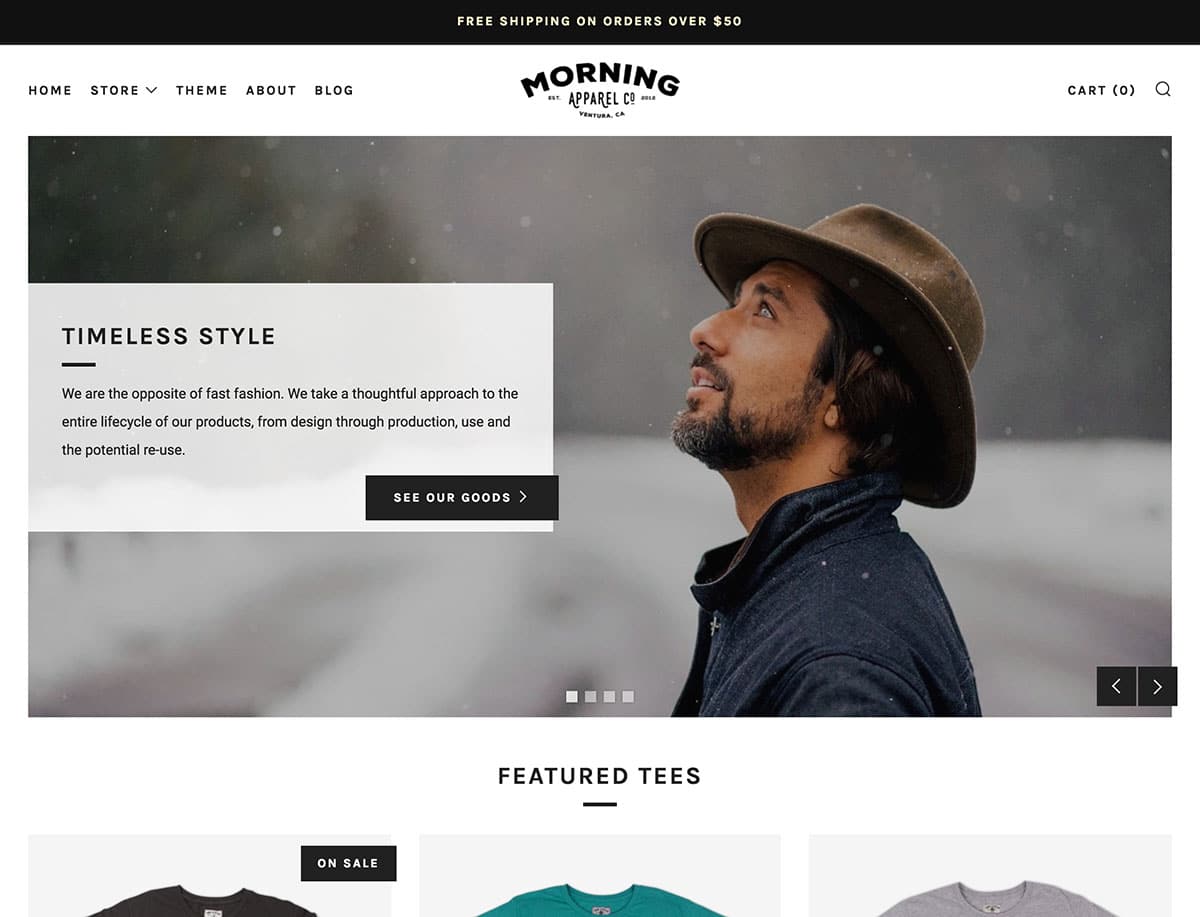 Bu temayla Shopify mağazanız, ziyaretçilerinizi ürünlerinizin bazı yüksek kaliteli fotoğraflarıyla veya markanızın hikayesini anlatmaya yardımcı olacak bazı ilham verici resimlerle karşılamaya hazır, ekranın üst kısmında tam genişlikte büyük bir kaydırıcıya sahip olabilir. Demo kaydırıcısını düzenlemek ve kendi içeriğinizi eklemek çok basittir. Mağazanızın ana sayfasının geri kalanı, öne çıkan ürünlerinizi gösteren bir panel, önerilen ürün koleksiyonlarınızı tanıtmak için bir bölüm ve teklif edilen tüm öğeleri listelemek için alan içerebilir.
