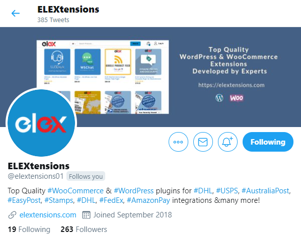 WordPress WooCommerce alanındaki bir diğer popüler eklenti geliştiricisi, burada nakliye, fiyatlandırma, müşteri desteği ve ödeme ağ geçitleriyle ilgili birkaç eklenti bulacaksınız. ELEX eklentilerinden birini kullanıyorsanız, özellik eklemeleri, iş vakaları ve ipuçları hakkında sık sık güncellemeler olduğundan, bu Twitter tanıtıcısı kesinlikle yardımcı olacaktır.