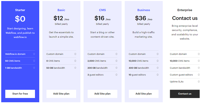 Profesyonel bir web sitesi tasarımcısıysanız ve en ucuz planı istiyorsanız, Webflow sizin için en iyisidir. Kullanımı kolay işlevler sağlayan hibrit web sitesi oluşturucularından biridir.