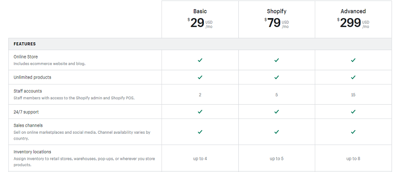 İşte Shopify'ın e-Ticaret web sitesini oluşturmak için fiyatlandırma ve planları. Bütçenize ve gereksinimlerinize göre bu ucuz planlardan herhangi birini seçebilirsiniz. Yani planlar şunları içeriyor:
