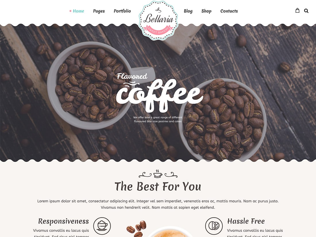 Bellaria kafe demosuna göz atarsanız, web sitenize eğlenceli ve davetkar bir görünüm kazandıracak ana sayfa için şık bir şablon içerdiğini göreceksiniz. Başlık bölümü, demoda bazı kahve çekirdeklerinin bir görüntüsünü görüntülemek için kullanılan ve ziyaretçilerinizin dikkatini bazı göz alıcı içeriklerle çekmenize olanak tanıyan büyük bir fotoğraf için alana sahiptir.