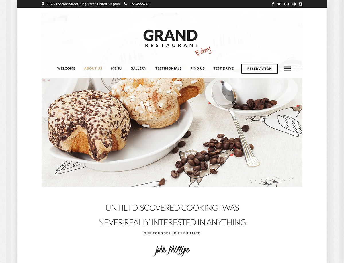 Grand Restaurant, uygun şekilde büyük bir web sitesine ihtiyaç duyan daha lüks kafeler için ideal olan şık bir temadır.