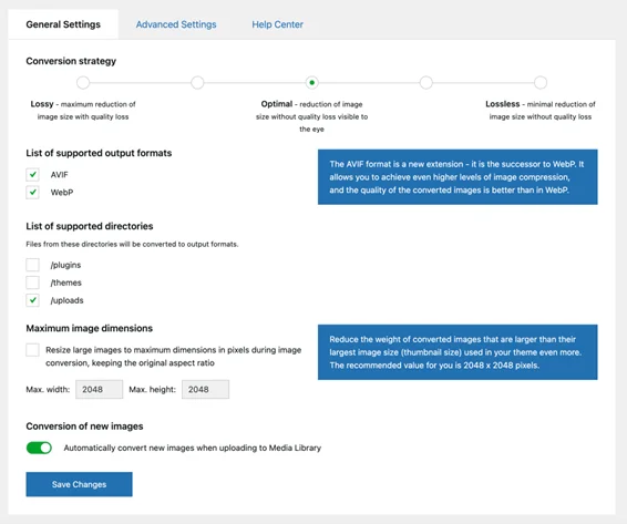 Hangi dizin dosyalarının çıktı biçimine dönüştürülmesi gerektiğini de seçebilirsiniz. Varsayılan olarak, yalnızca yüklemeleriniz (Medya Kitaplığındaki resimler) dönüştürülür. Ancak, görüntü dosyalarını ikisinden de dönüştürmek istiyorsanız /themes veya /plugins dizinini kontrol edebilirsiniz.