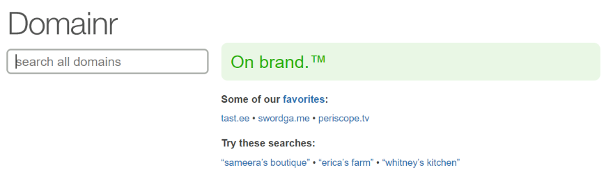 Domainr, her harfi yazarken seçenekler sunar. Kullanılabilir alan adları, satın alma bağlantısıyla birlikte yeşil renkte olacaktır. Onlara tıklamak, satın alabileceğiniz kayıt şirketlerinin bir listesini açar. Alınan bir isme tıklamak, teklif verme ve WhoIs bilgilerini içeren bir seçenekler listesi açar.
