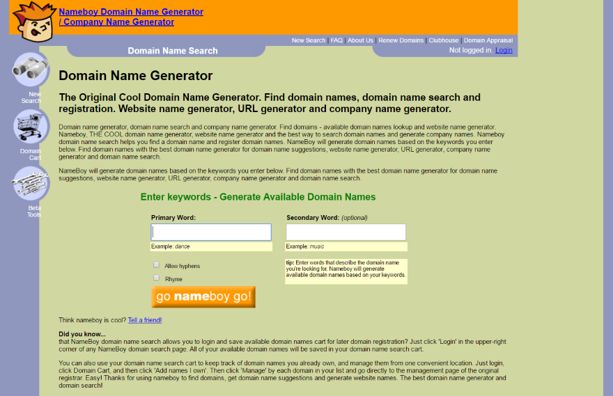 Nameboy, birincil bir anahtar kelime, ikincil bir anahtar kelime girmenize ve kısa çizgi veya tekerlemelere izin vermeyi seçmenize izin verir. Sonuçlar, müsaitlik durumuna göre renk kodlu olacak olan adı ve uzantıları gösteren bir tabloda görüntülenecektir. İlgilendiğiniz uzantıyı seçebilir ve ardından sepete ekleyebilir veya teklif verebilirsiniz.