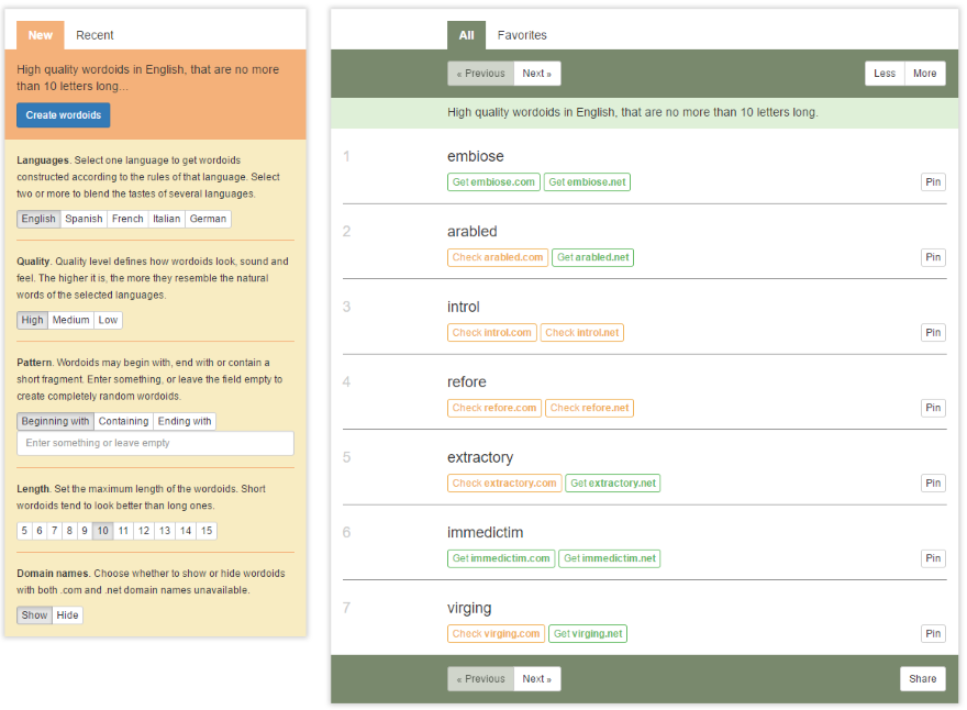 target=”_blank” rel=”nofollow”Wordoid, yaptığınız seçimlere göre uydurma kelimeler oluşturur. Dillerinizi (yalnızca bir veya 5 dile kadar karıştırın), kalite düzeyini (görünümü, sesi ve hissi), deseni (başlangıç, içerme veya bitiş) ve uzunluğu (5-15 karakter) seçin. Sonuçlar, kullanılabilirliklerini ve satın alma bağlantılarını gösteren kutularla listelenir. Favoriler listenize kaydetmek için sabitleyebilirsiniz.