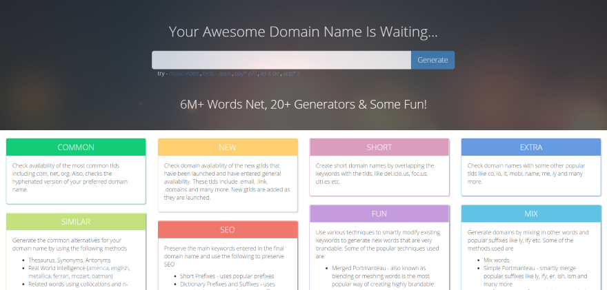 Çok az sayıda ad bulunduğundan, alan adınız için bir ad düşünmek zor olabilir. Bir alan adı oluşturucu, bir başlangıç yapmak için harika bir yoldur ve daha önce hiç düşünmediğiniz adlar sağlayabilir ve hatta sadece sizin için yepyeni bir kelime oluşturabilir.