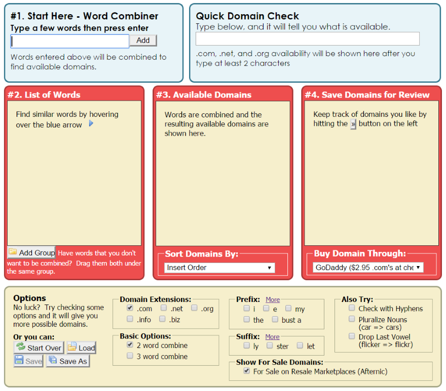 Bust a Name, çok sayıda anahtar kelime girmenize ve ardından bunları alan adları oluşturmak için çeşitli şekillerde birleştirmenize olanak tanır. Anahtar kelimeleri kaldırabilir veya ilgili kelimeleri seçebilir ve kelime grupları oluşturabilir ve kelimelerin birleştirilmesini önleyebilirsiniz. Sonuçları sıralayabilir, satın alabilir ve daha sonra incelemek üzere kaydedebilirsiniz. 2 veya 3 kelime kombinasyonu seçme, önek ve son ek seçme, kısa çizgi ekleme, çoğullaştırma ve son sesli harfi çıkarma gibi seçenekleri seçin.