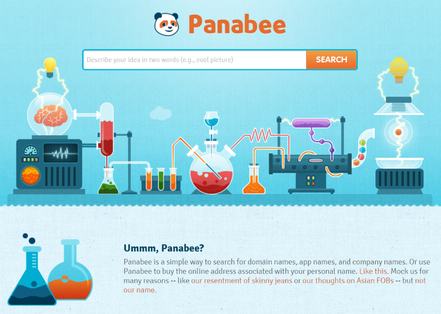 Panabee, bir fikri iki kelimeyle tanımlamanıza izin verir ve ardından size bu kelimelere dayalı bir alan listesi verir. Sonuçlar .com'dur, ancak isterseniz diğer uzantıları görmeyi seçebilirsiniz. Her sonuç bir kalp simgesiyle görüntülenir. Varsa simge mavi olur ve alan adı, satın alma bağlantısıyla birlikte bir fiyat içerir. Mevcut değilse, kalp kırmızı ve kırık olacaktır ve alan adı benzer adları görmek için bir bağlantı içerecektir.