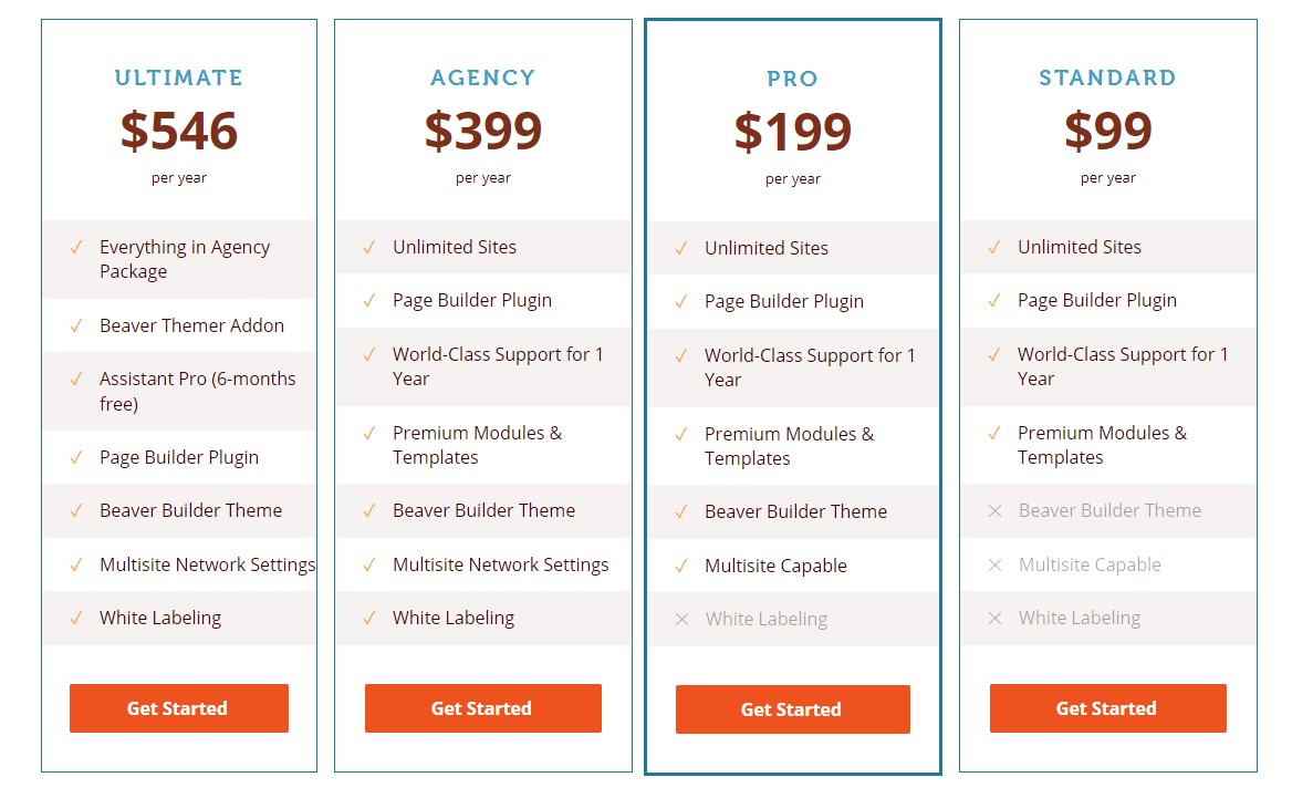 Beaver Builder ayrıca dört profesyonel plan sunar: