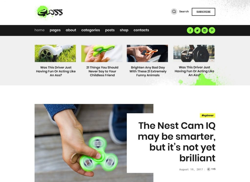 Gloss, mükemmel bir ücretsiz blog haline gelebilecek renkli ve çekici bir WP temasıdır. Şablonda beş farklı ana sayfa, bir dizi harika blog yazısı düzeni (Satranç, Klasik, Portföy ve daha fazlası gibi), özel widget'lar ve kısa kodlar vb. bulunur. Ancak Elementor desteği sayesinde ihtiyaç duyduğunuz kadar yeni blok ve düzen ekleyebilirsiniz. Tema, tüm popüler sosyal medya platformlarıyla akıllı entegrasyonlara sahiptir. Bu, kullandıkları platformdan bağımsız olarak hedef kitlenizle bağlantı kurmanıza olanak tanır.
