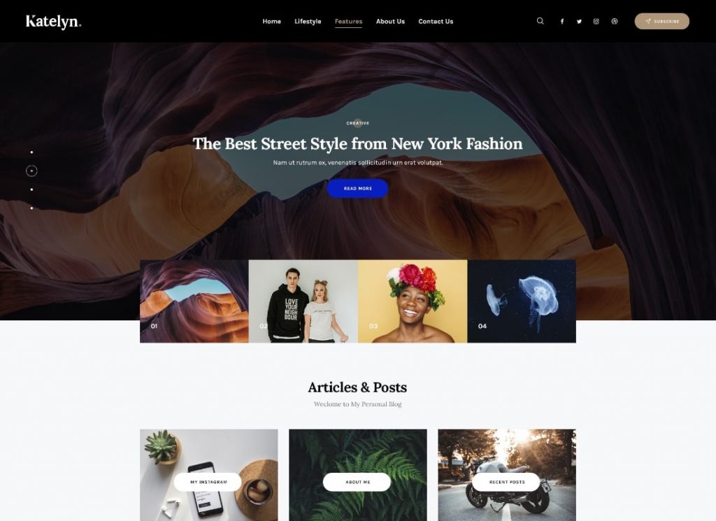 Katelyn, resimlerinizi, görsellerinizi, listelerinizi, testlerinizi ve daha fazlasını sergileyebileceğiniz şık bir ücretsiz WordPress temasıdır. Gutenberg sayfa oluşturucuyu temel alır, bu nedenle şablon tüm Gutenberg bloklarını, gelişmiş blok stillerini, ekstra tema kısa kodlarını ve daha fazlasını destekler. Ayrıca, ücretsiz blogunuz, bu temanın %100 SEO hazırlığı sayesinde Google'da üst sıralarda yer alma şansına sahiptir. Katelyn çok sayıda öğeyle doludur; bu, blogunuz için düzen oluşturmanın ve özelleştirmenin çok kolay olacağı anlamına gelir.