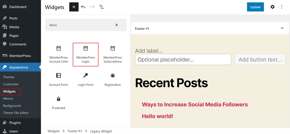 Giriş widget'ını web sitenizin herhangi bir alanına ekleyebilirsiniz.