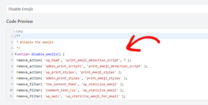Bu yöntem için, WordPress'te emoji desteğini devre dışı bırakmak için özel bir kod parçacığı kullanacağız.