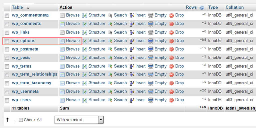 wp_options tablosundaki alanları listeleyen sayfaya erişmek için wp_options'ın yanındaki 'Gözat' düğmesine tıklayın veya kenar çubuğu bağlantısını kullanın.