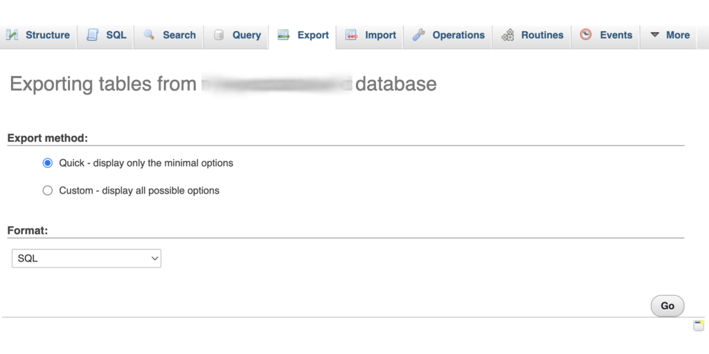 6. 'Hızlı'yı seçtikten sonra 'Git' düğmesine tıklayın. Bu, dışa aktarma işlemini başlatacak ve veritabanınız bilgisayarınıza indirilecektir.