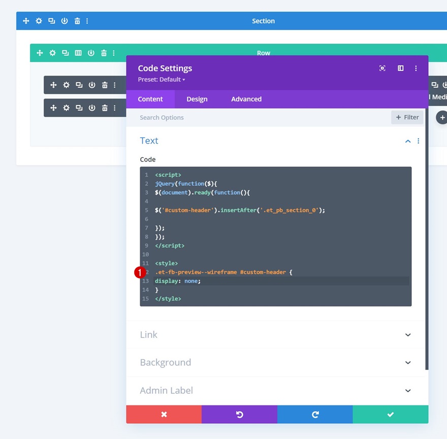 Satırın ilk sütununa yeni bir Kod Modülü ekleyerek devam edin.