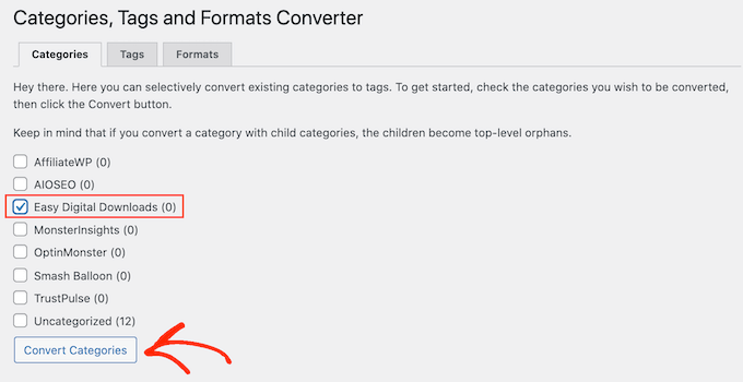 Bir kategoriyi etikete dönüştürmek için yanındaki kutuyu işaretlemeniz yeterlidir. Daha sonra 'Kategorileri Dönüştür' düğmesine tıklayabilirsiniz.