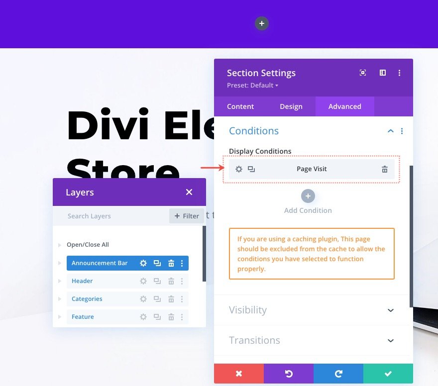 Bu öğreticide, yalnızca bir kullanıcı açılış sayfasını ziyaret ettiğinde bir duyuru çubuğunu görüntülemek için Divi'nin koşul seçeneklerini kullanacağız. Duyuru çubuğu, Divi Builder kullanılarak istediğiniz herhangi bir içerik veya tasarım türünü içerecek şekilde kolayca oluşturulabilir. Oluşturulduktan sonra, aşağıdaki basit adımları uygulayarak Sayfa Ziyareti koşulunu duyuru çubuğuna (bu durumda bir Divi bölümüdür) ekleyebilirsiniz: