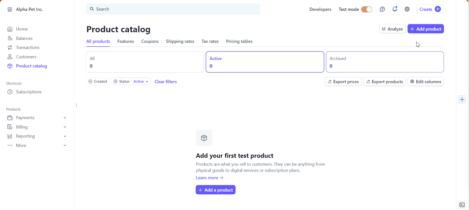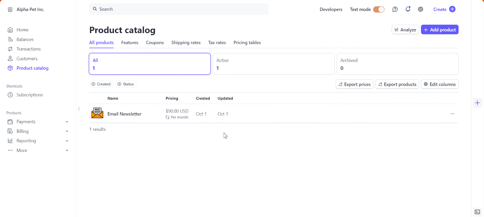 Stripe web sitesine gidin ve hesabınızda oturum açın. Abonelik ürünlerinizi yönettiğiniz Ürün Kataloğuna gidin.