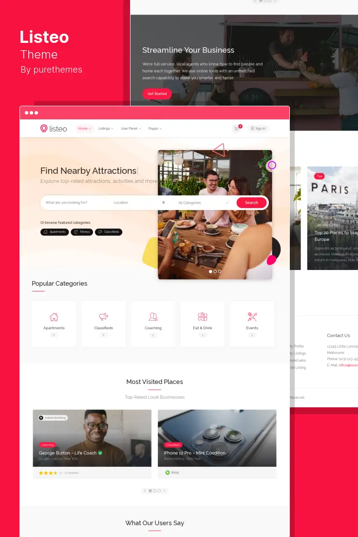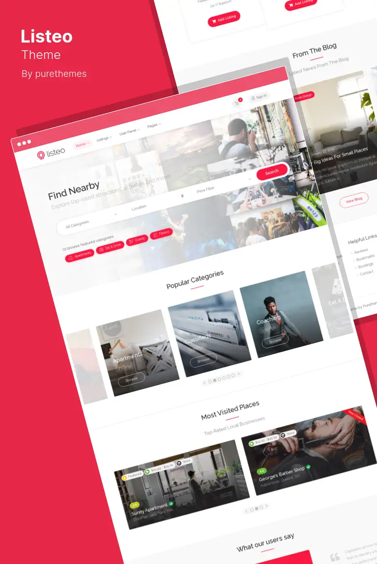 Listeo, Yelp, Airbnb, Booking.com, Gumtree, OLX veya Etsy gibi çok satıcılı bir pazar yeri gibi popüler platformlara benzer profesyonel bir dizin ve ilan web sitesi oluşturmanıza olanak tanıyan hepsi bir arada bir WordPress dizin temasıdır.