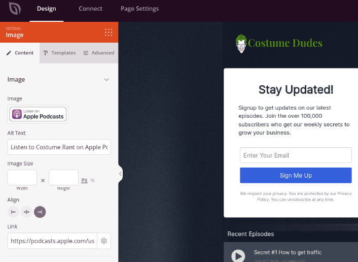 Podcast sayfanızı tasarlamayı bitirdikten sonra, sayfa oluşturucunuzun üst kısmındaki Bağlan sekmesine tıklayın ve sitenizde olası satışları toplamak için e-posta pazarlama sağlayıcınızı seçin.