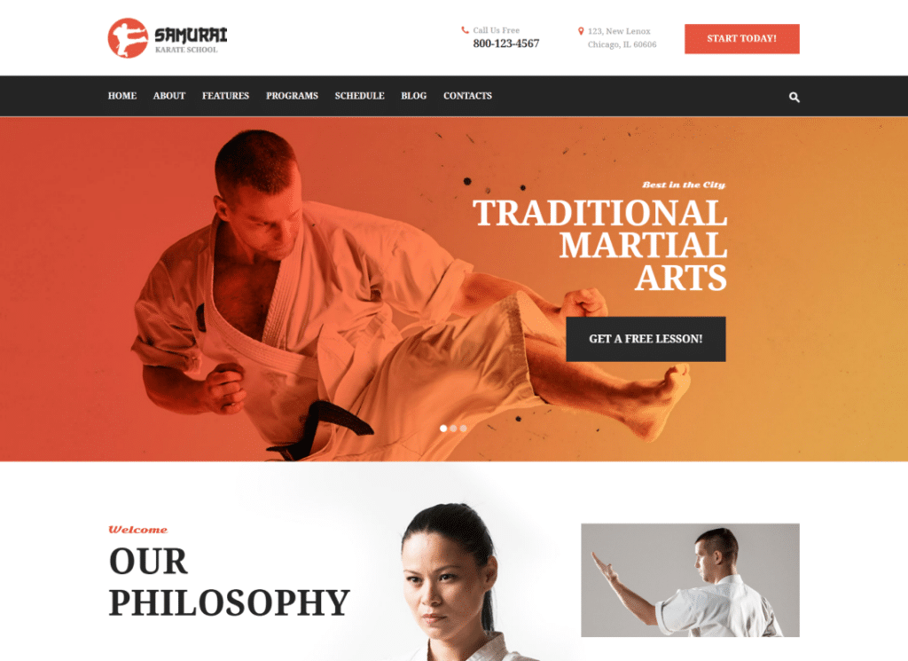 Samurai, karate, güreş, boks, MMA, tekvando, aikido ve karma dövüş dahil olmak üzere dövüş sanatları için tasarlanmış modern, temiz ve hızlı yanıt veren bir WordPress temasıdır. Tema ayrıca, her beceri seviyesi ve yaş için spor giyim, dişli çözümleri, özel ekipman, aksesuar ve ekipman satmak için WooCommerce kullanarak bir çevrimiçi mağaza kurmanıza olanak tanır.