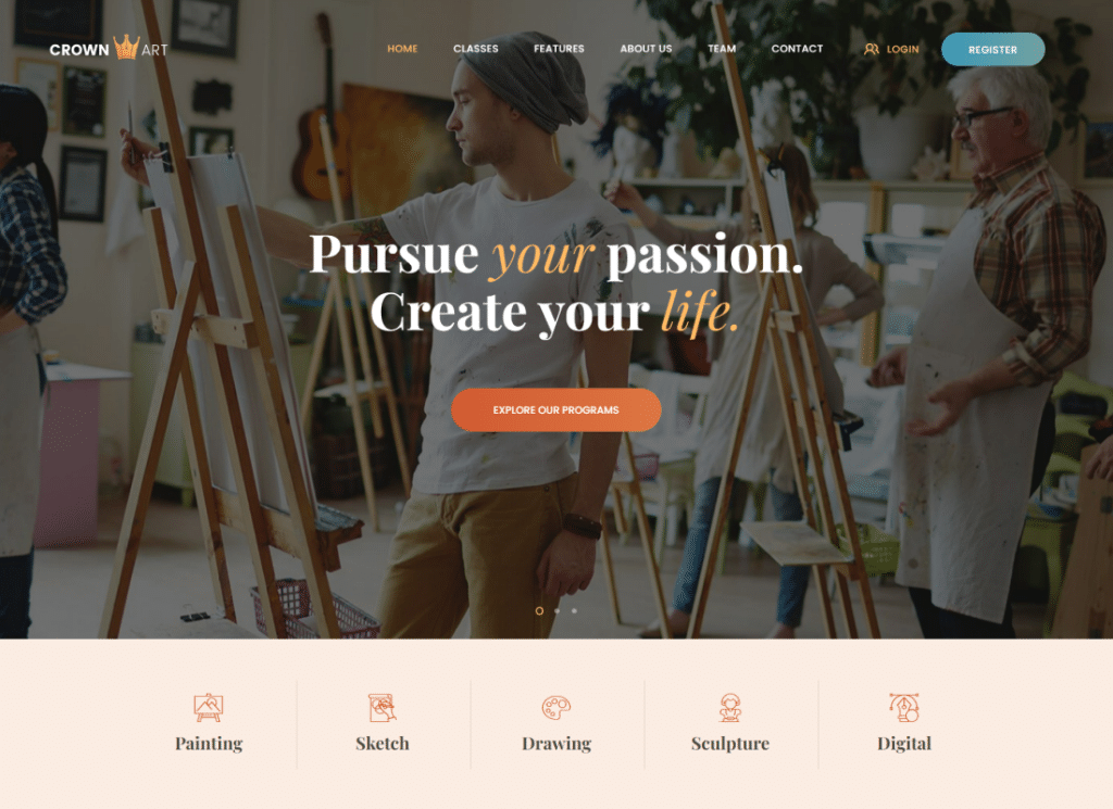Crown Art, bir sanat okulu için tasarlanmış modern ve işlevsel bir WordPress Temasıdır. Öğrencileri yaklaşan etkinlikler ve etkinlikler hakkında bilgilendirmeyi kolaylaştıran Etkinlik Takvimi desteğiyle birlikte gelir. Tema tamamen duyarlıdır ve Retina Hazırdır, bu da herhangi bir cihazda harika görünmesini sağlar. Crown Art, web sitenizi kurma ve çalıştırma sürecini basitleştirmek için Revolution Slider, Essential Grid, WPBakery Sayfa Oluşturucu ve Instagram Akışı gibi bir dizi premium eklentiyle de uyumludur.