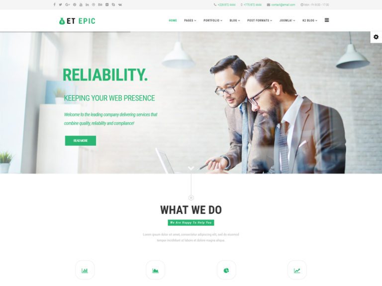 ET Epic çok duyarlıdır Joomla Finans şablonu, özellikle finansal işler için tasarlanmış mükemmel çözümler sunar. Birincisi, çoğu sosyal medya entegrasyonuna, iletişim formlarına, yerleşik haritalara ve müşterilerle kusursuz çevrimiçi etkileşim sağlayan diğer özelliklere sahiptir. Aynı şekilde şablon, %100 duyarlı düzen, çapraz tarayıcı uyumluluğu ile mobil/tablet sürümünü destekler. Ayrıca, çeşitli düzenler ile profesyonel web siteleri oluşturmaya yardımcı olan 4 renk şeması ve kutulu düzen ile birlikte gelir. Daha fazlasını aramayın!