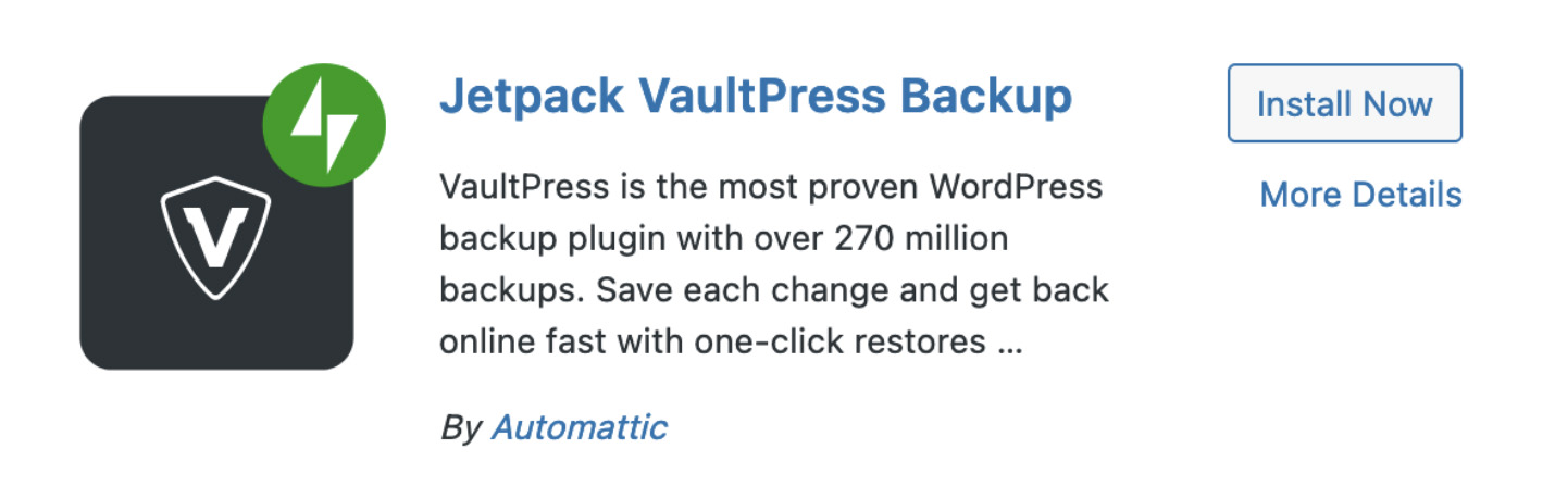 VaultPress Backup, son on yılda 269 milyondan fazla yedeklemeyle en kanıtlanmış WordPress yedekleme eklentisidir. Web siteniz ve işletmeniz için en iyisini istiyorsanız VaultPress Backup'ın sunduğu şeylere bayılacaksınız: https://jetpack.com/upgrade/backup/