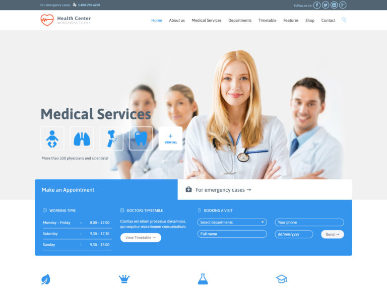 MediClinic, harika bir dental web sitesi demosu ile çok amaçlı bir sağlık ve tıbbi WordPress temasıdır.