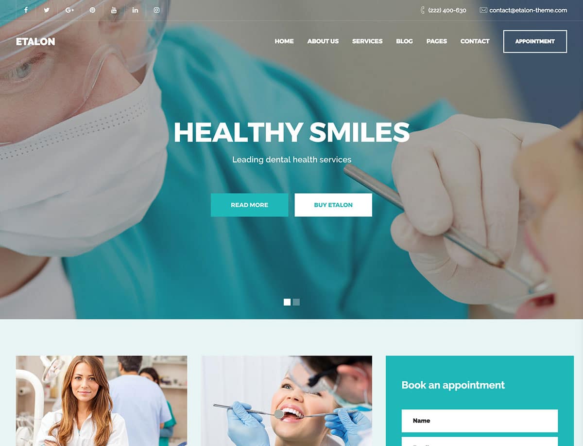 Diş kliniğinizden görüntüleri paylaşmak veya sadece dişle ilgili ilham verici fotoğrafları görüntülemek için ideal olan büyük tam ekran ana sayfa slayt gösterisi ile Etalon dental demosu, web sitenizin sitenize gelir gelmez ziyaretçilerinin dikkatini çekmesine yardımcı olmalıdır. Ana sayfadaki hızlı form, ziyaretçilerinizin daha fazla bilgi edinmek istediklerinde size mesaj göndermelerini çok kolaylaştırırken, randevu almaya hazır olanlar, isteğe bağlı, daha ayrıntılı iletişim formu veya kullanarak randevu alabilirler. web sitesinin üstbilgi ve altbilgisinde görüntülenen telefon numarası.