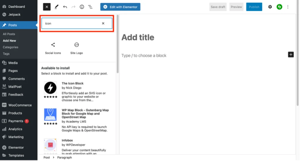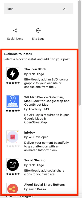 Varsayılan olarak Gutenberg, 'Bloklar' arama çubuğuna 'Simge' yazarak erişebileceğiniz yalnızca birkaç sosyal simge içerir: