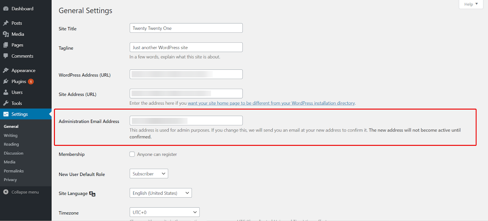 Ardından, web sitesi yöneticisi e-posta adresinizi yapılandırmalısınız. Genellikle, WordPress'i yeni kullanmaya başlayanlar, web sitelerini kurarken kişisel e-posta adreslerini girerler veya barındırma sağlayıcıları tarafından sağlanan e-posta adresini kullanırlar. Yönetici e-posta adresi WordPress tarafından önemli bildirimler göndermek ve parola kurtarma ve değişiklikleri için kullanıldığından, web sitesi yönetici e-posta adresinizi mümkün olan en kısa sürede değiştirmeniz önemlidir.