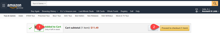 实现清晰的一种方法是在不同的页面上从一个步骤移动到另一个步骤。 与其让结账流程向下滚动页面(或包含在单个部分或框中),不如让您的用户从产品页面导航到购物车页面到结账页面到选择您的付款页面再到下订单页面确认页面。 (亚马逊就是这样做的,如下图所示)。