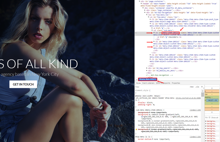 转到您的主页,将鼠标放在菜单上并开始检查代码。 您将看到 CSS ID 出现在所选的菜单项上。 复制子菜单列表中的每个 CSS ID 并保存以备后用。