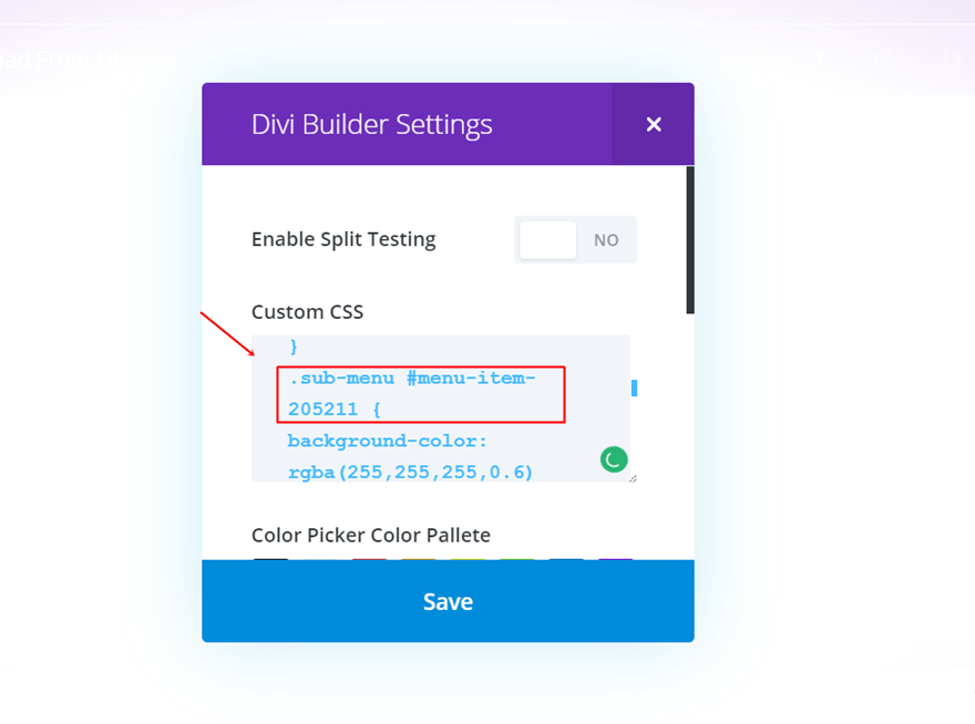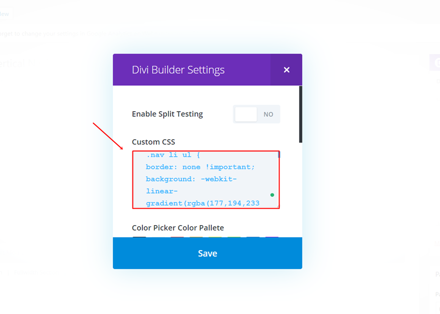 在出现的屏幕中,将以下 CSS 代码行复制并粘贴到自定义 CSS 字段中:
