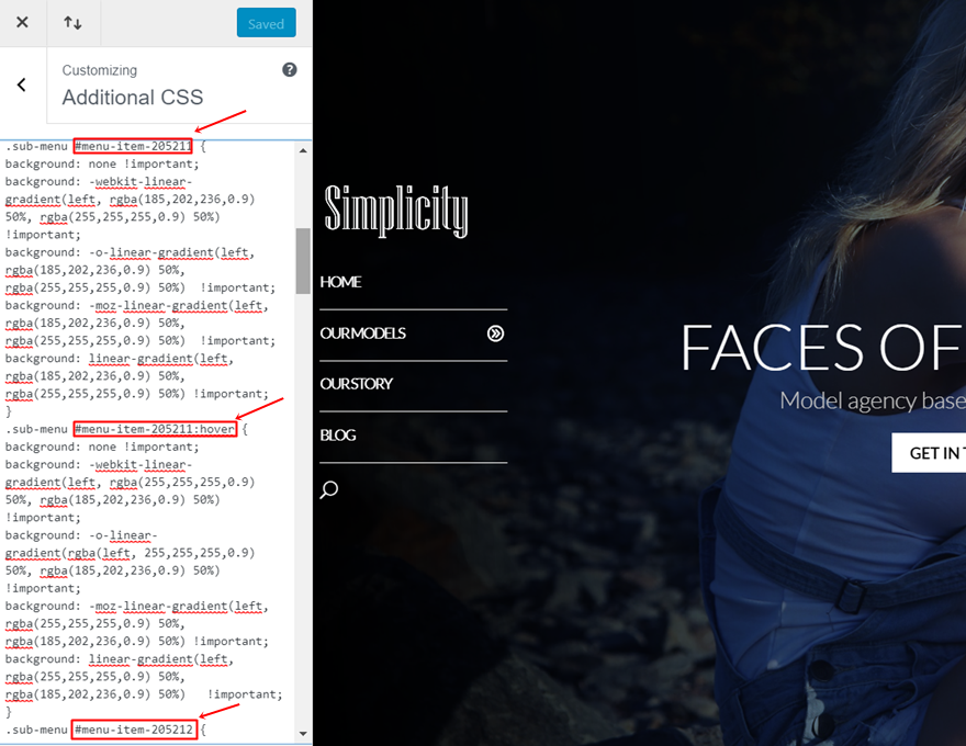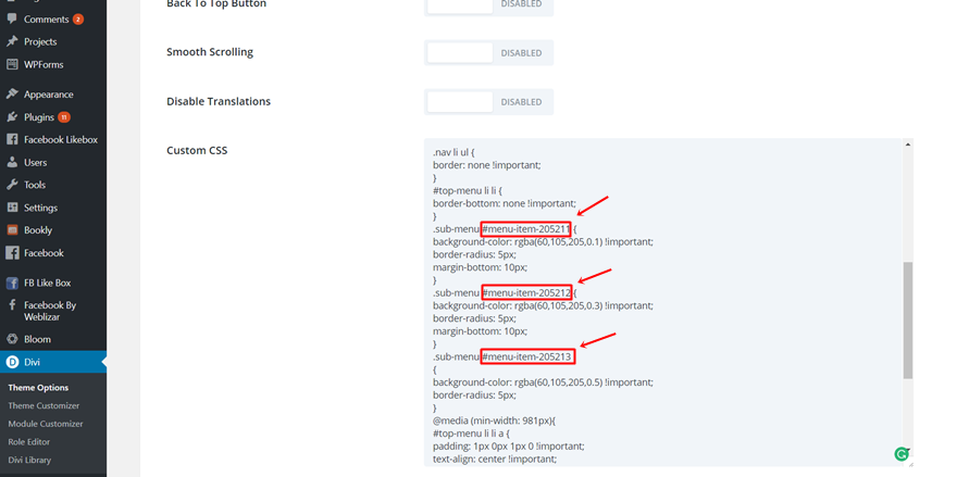 将代码中的以下 CSS ID 替换为适用于您的子菜单的 CSS ID。 在这篇文章的上一步中,我们已经向您展示了在哪里可以找到它们。