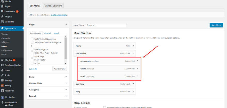 如果您在WordPress 仪表板上,请转到外观 > 菜单。 如果您已经创建了一个菜单,请使用该菜单。 如果没有,请从制作新菜单开始。 然后,将主菜单项添加到您的菜单中。 完成后,您可以添加子菜单项。 添加一个子菜单项,只需将其放在主菜单项下即可。 对要添加到垂直导航的所有子菜单项执行此操作。