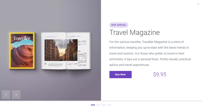 使产品滑块看起来特别的是它的极简主义方法。 滑块的底部是产品的巨大图像,非常引人注目。 如此大的滑块将有足够的空间来描述产品。 但是,此滑块仅显示最基本的详细信息:名称、类别、价格和购买按钮。 因此,它们只覆盖了图像的一小部分,这样客户就可以检查每一个细节。