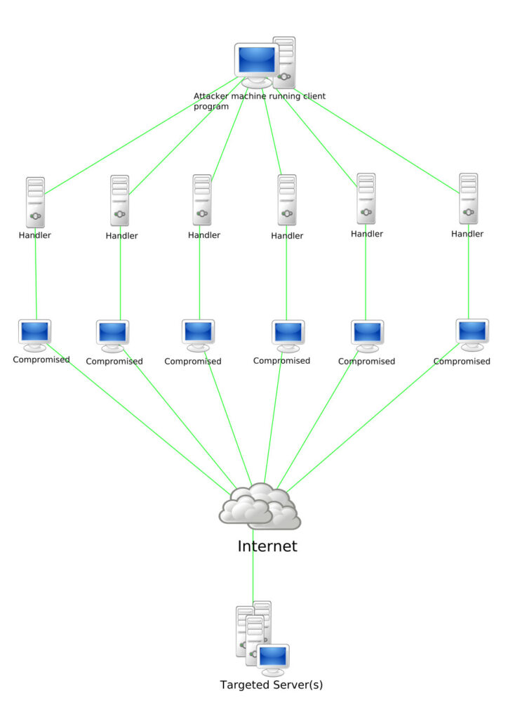 DoS 攻击通常通过僵尸网络进行,这意味着计算机已被病毒或特洛伊木马渗透,黑客可以远程控制。 在这种情况下,您还谈到“分布式拒绝服务”或 DDoS。