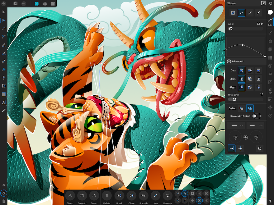 - 在台式机和 iPad 上,节点可以针对曲率和角度进行个性化设置。 这对插画师来说是一个巨大的优势。