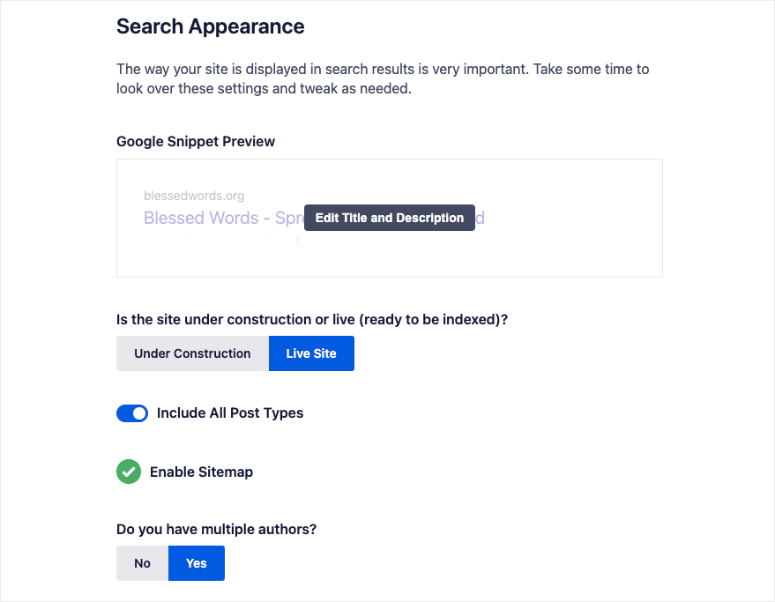 接下来,您可以看到您的网站在 Google 搜索中的显示方式的片段。 如果你想在设计时对访问者隐藏它,你也可以让你的网站保持建设中。