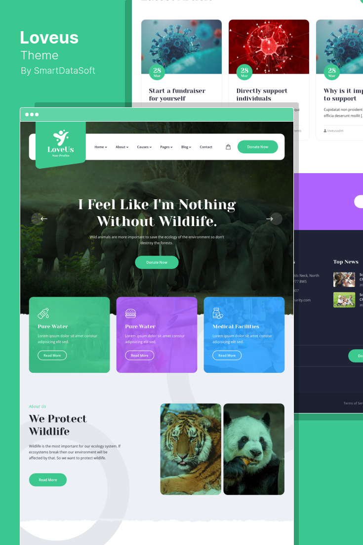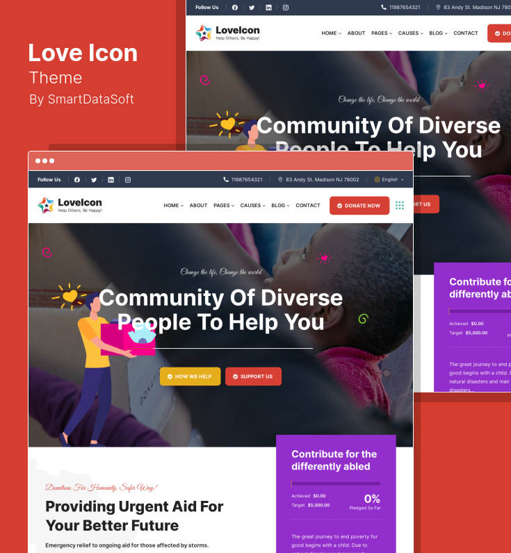 Loveus 是一个优雅干净的 WordPress 慈善主题,可供各种非营利组织使用,包括慈善机构、非政府组织、教堂和其他非营利组织。